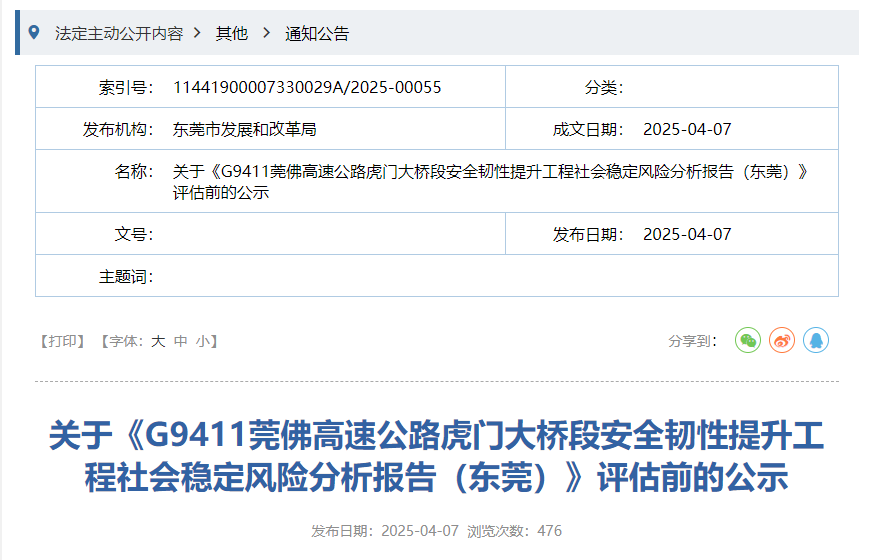 東莞市發展和改革局官網截圖 近日,東莞市發展和改革局發布相關公告,公告稱,虎門大橋段多座橋樑在長期重載車流下,承載能力不滿足要求,耐久性顯著下降。根據《交通運輸部關於進一步提升公路防災減災能力的指導意見》(交公路發〔2024〕76號),計畫開展莞佛高速公路虎門大橋段安全韌性提升工作,從而提升虎門大橋段安全韌性、恢復通道交通功能、保證結構安全耐久。 公告顯示,項目實施範圍內,總投資約15.5億元人民幣。擬在廣州南沙區和東莞虎門鎮對莞佛高速公路虎門大橋段既有道路及橋樑實施安全韌性提升,項目建設不涉及新增用地用海,建設內容包括部分橋樑構件養護、橋面鋪裝更換、交安機電設施升級改造、過江段橋樑耐久性處置等,全面提升全線結構物安全韌性。預計2025年10月開工,2027年12月完工,工期為27個月。其中,封閉道路施工12-15個月。