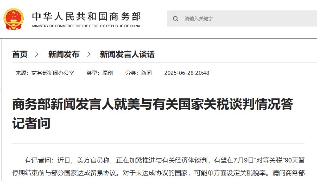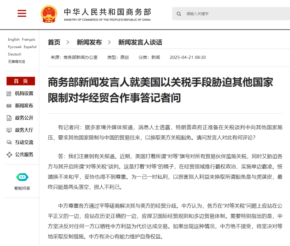中國商務部官網截圖 據多家境外媒體報道,消息人士透露,特朗普政府正準備在關稅談判中向其他國家施壓,要求其他國家限制與中國的貿易往來,以換取美方關稅豁免。 對此,中國商務部發言人表示,近期,美國打著所謂“對等”旗號對所有貿易夥伴濫施關稅,同時又脅迫各方與其開啟所謂“對等關稅”談判。這是打著“對等”的幌子,在經貿領域推行霸權政治、實施單邊霸凌。綏靖換不來和平,妥協也得不到尊重。為一己一時私利,以損害別人利益來換取所謂豁免是與虎謀皮,最終只能是兩頭落空,損人不利己。 發言人說,中方尊重各方通過平等磋商解決其與美方的經貿分歧。中方認為,各方在“對等關稅”問題上應站在公平正義的一邊,應站在歷史正確的一邊,應捍衛國際經貿規則和多邊貿易體制。需要特別指出的是,中方堅決反對任何一方以犧牲中方利益為代價達成交易。如果出現這種情況,中方絕不接受,將堅決對等地採取反制措施。中方有決心有能力維護自身權益。 發言人強調,面對單邊主義和保護主義衝擊,誰都無法獨善其身。國際貿易一旦回歸弱肉強食的“叢林法則”,所有國家都會淪為受害者。中方願與各方加強團結協調,攜手應對,共同抵制單邊霸凌行徑,維護自身正當權益,捍衛國際公平正義。(完) 【編輯:石歡歡】