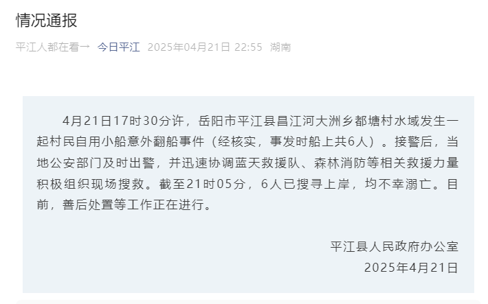 湖南省岳陽市平江縣人民政府辦公室發布情況通報 圖源:“今日平江”微信公眾號截圖 接警後,當地公安部門及時出警,並迅速協調藍天救援隊、森林消防等相關救援力量積極組織現場搜救。截至21時05分,6人已搜尋上岸,均不幸溺亡。目前,善後處置等工作正在進行。(完) 【編輯:彭玉婷】