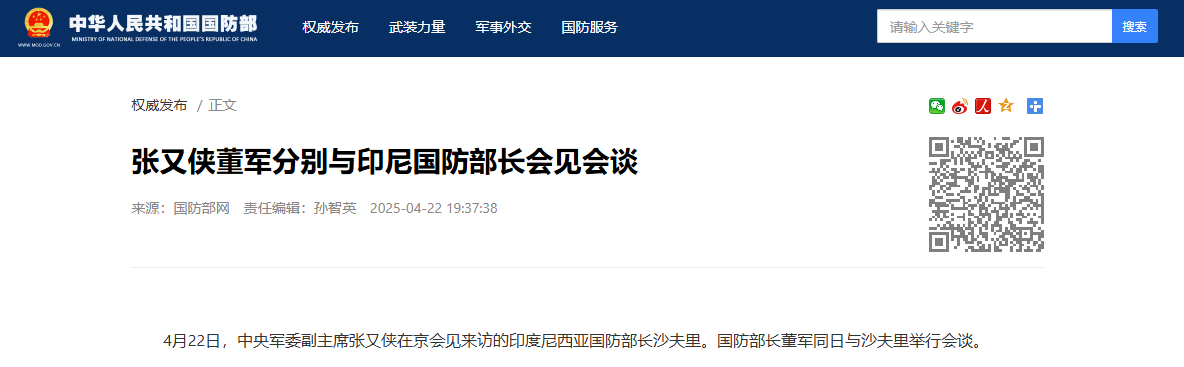 香港中通社4月22日電 據中國國防部網站消息,4月22日,中央軍委副主席張又俠在京會見來訪的印度尼西亞國防部長沙夫里。國防部長董軍同日與沙夫里舉行會談。