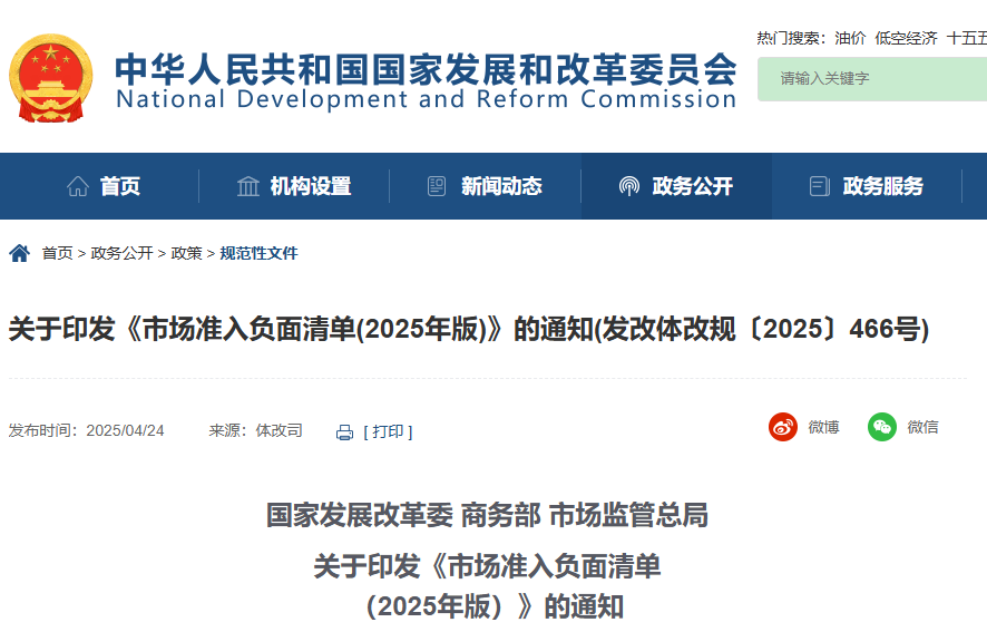 中國發改委官網截圖 《清單(2025年版)》准入門檻更低,刪除了8條全國性准入限制。如公章刻製業由許可制改為備案制,計算機信息系統安全專用產品銷售業務改為基於強制性國家標準的檢測認證制度,相關市場准入管理措施相應取消。 《清單(2025年版)》准入力度更大,部分放開了8條全國性措施。涉及試辦新型電信業務、電視劇製作、藥品批發和零售單位籌建、藥品和醫療器械互聯網信息服務、林木種子進口、發票印製等領域。這些相關領域保持了必要的市場准入管理,但准入環節更加精簡。 同時,刪除了17條地方性措施。涉及交通物流、貨運代理、貨運信息服務、森林資源損失鑒定、車輛租賃服務等,取消了相應的地方性許可措施,實施全國統一的准入方式。 中國國家發展改革委有關負責人當天就《清單(2025年版)》表示,一方面,新版清單降低准入門檻,激發市場活力。另一方面,新版清單依法規範重點領域准入,兜牢安全底線。包括納入新業態新領域管理措施。將“民用無人駕駛航空器運營合格證核發(微型無人駕駛航空器除外)”納入清單。將電子煙等新型煙草製品生產、批發、零售業務相關審批納入清單。規範醫藥和醫療器械網絡銷售准入條件。還包括強化重點領域風險防控。明確非金融機構不得違法使用“期貨公司”字樣。將重要工業產品許可證管理範圍從10大類調整為14大類27種,更好保障生產安全。 從2018年中國首版市場准入負面清單出台到現在,共經歷四次修訂,清單事項數量由2018年的151項壓減至目前的106項,壓減比例約30%。(完) 【編輯:彭玉婷】