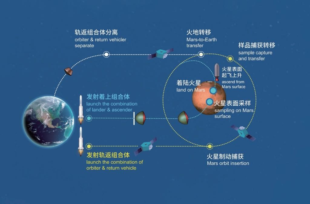 這是天問三號任務過程示意圖。新華社發(深空探測實驗室供圖) 據介紹,天問三號探測器由著陸器、上升器、服務器組合體和軌道器、返回器組合體組成,共配置6台科學載荷。其中,軌道器環火軌道為約350公里圓軌道,姿態對日定向;服務器環火軌道為近火點約400公里環火大橢圓軌道,留軌探測約2個火星年。按計劃,天問三號任務將於2028年前後發射實施。(完) 【編輯:彭玉婷】