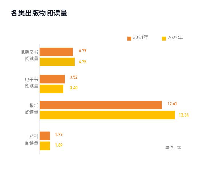 圖自北京日報客戶端 此外,中國成年國民圖書閱讀率為59.9%,報紙閱讀率為22.5%,期刊閱讀率為17.1%,數字化閱讀方式(電腦端網絡在線閱讀、手機閱讀、電子閱讀器閱讀、Pad閱讀、聽書、視頻講書等)接觸率為80.6%。 調查指出,數字化閱讀方式持續深入成年國民生活,2024年有78.7%的成年國民進行過手機閱讀,38.5%的成年國民通過聽書的方式進行閱讀,23.6%的成年國民使用Pad(平板電腦)進行閱讀,5.7%的成年國民通過視頻講書的方式進行閱讀。 調查顯示,2024年中國成年國民人均每天閱讀紙質圖書24.41分鐘,人均每天閱讀報紙4.17分鐘,人均每天閱讀期刊2.85分鐘。中國成年國民人均每天手機接觸時長為108.76分鐘,人均每天通過電腦端網絡在線閱讀時長為63.76分鐘。 此外,2024年中國有38.5%的成年國民通過聽書的方式閱讀,高於2023年的36.3%。(完) 【編輯:吳一帆】