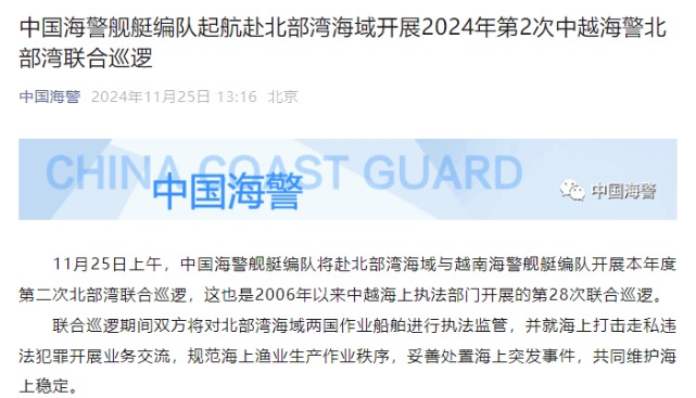 中國海警永興艦、西沙艦與越南海警8004、8003船開展了2025年第一次北部灣海域聯合巡邏。圖源:中國海警 據中國海警局25日消息,本次聯合巡邏是為持續深化拓展中越海警海上合作領域、增強執法合作實效,共同維護北部灣海域安全穩定及漁業生產秩序,推動中越兩國海警友好交流合作。 巡邏期間,對兩國作業船舶進行監管,對漁船民開展宣傳教育,累計巡邏51.6小時、255.5海裡,共觀察記錄作業漁船18艘,海上生產作業秩序總體良好。雙方還開展海上聯合搜救演練,提升了兩國海警聯合應急處置水平。 中國海警局表示,中越海警北部灣海域聯合巡邏是落實兩國關於深化兩國海警海上執法合作重要共識的具體舉措,進一步體現了中越海警貫徹落實兩國領導人重要共識的堅定決心,已成為南海海上執法合作樣板,為養護北部灣漁業資源、維護漁業生產秩序、打擊海上違法犯罪、維護地區安全穩定發揮了積極作用。 北部灣海域位於北部灣以南,整個海域處在中國海南島、西沙群島和越南之間。 另外,據中國海軍此前消息,中越第38次北部灣聯合巡邏本月17日圓滿結束。這次聯合巡邏為期2天、總航程200餘海里,中越雙方共派出4艘海軍艦艇參加,中方任務兵力為永州艦和阿壩艦。(完) 【編輯:彭玉婷】