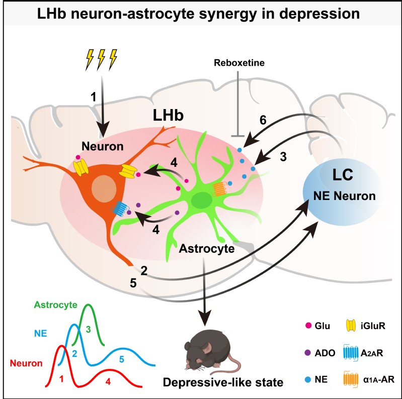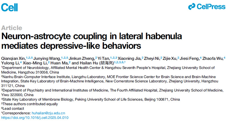 該項研究已發表於國際學術期刊《細胞》。圖源:浙江大學官網/課題組供圖 “人類社會中,頻繁的、持續的壓力是抑鬱的最常見誘因。”胡海嵐表示,團隊此前的一項研究發現,抑鬱樣行為源自大腦外側繮核神經元的簇狀放電,但當時他們並不知道這些神經元為什麼出現了異常,於是團隊決定進一步探究原因。 據新華網報道,研究團隊設計了動物實驗,用1秒鐘隨機的足底電擊給小鼠製造一次壓力,然後觀察壓力信息在大腦中的傳播路徑。研究團隊發現,大腦中有一個“壓力電台”,外側繮核神經元、藍斑核去甲腎上腺素能神經元和外側繮核星形膠質細胞三位“主播”坐鎮。當壓力來臨,三位“主播”跨腦區聯動“播送”壓力信息。經過外側繮核星形膠質細胞的推波助瀾,短暫的壓力刺激會轉化為持續時間更長的神經元活動。實驗中,短短1秒鐘的壓力刺激會引發外側繮核神經元和藍斑核去甲腎上腺素能神經元長達1分鐘左右的持續活動。