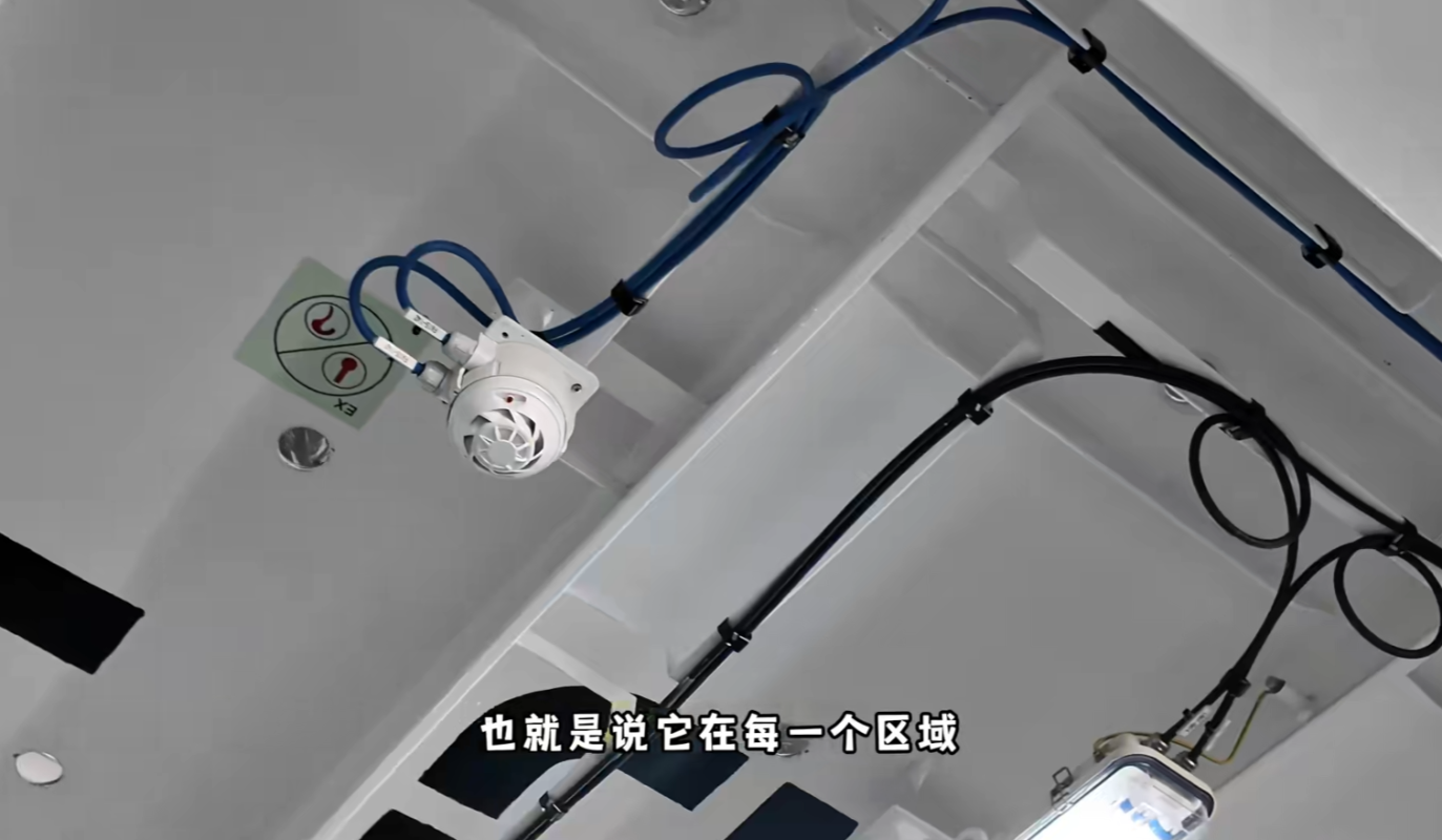 天花板上還有很多報警裝置,每一個區域都會實時去監測車輛安全,一旦發生火情的話,它就會噴灑出二氧化碳進行滅火。