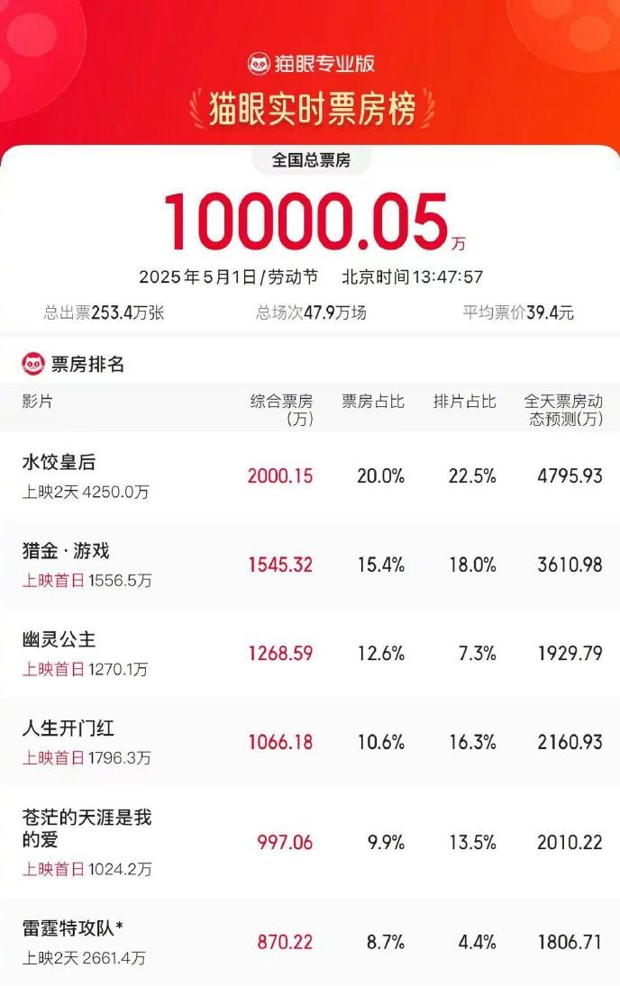 數據顯示,票房前六的影片分別為《水餃皇后》、《雷霆特攻隊》、《人生開門紅》、《獵金·遊戲》、《幽靈公主》和《蒼茫的天涯是我的愛》。 內地媒體分析認為,五一首日票房迅速破億,顯示民眾觀影熱情高漲,市場表現強勁。 公開資料顯示,假期期間,新推出的影片多達10部,涵蓋喜劇、動作、懸疑、動畫等多種類型,滿足不同觀眾需求。 燈塔專業版的早前數據顯示,4月25日五一新片預售票房突破1000萬元人民幣,4月28日更超過3000萬元,顯示市場預期樂觀。 五一作為中國電影市場的重要檔期,競爭激烈,部分影片提前點映以搶占市場。 2025年春節檔票房突破100億元人民幣,創歷史新高,為五一檔的火爆表現奠定信心。(完) 【編輯:林曉惠】