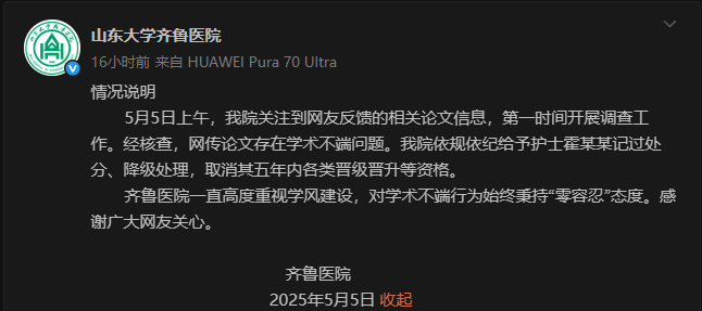 香港中通社5月5日電 中國山東大學齊魯醫院5日發布情況說明稱,當日上午,醫院關注到網友反饋的相關論文信息,第一時間開展調查工作。經核查,網傳論文存在學術不端問題。醫院依規依紀給予護士霍某某記過處分、降級處理,取消其五年內各類晉級晉升等資格。