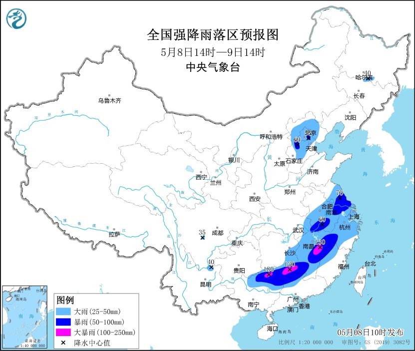 圖源:中央氣象台 中央氣象台8日10時發佈暴雨黃色預警,預計8日14時至9日14時,江淮南部、江南西南部和中東部、華南北部,以及華北中北部等地部分地區有大到暴雨。其中,江西東部、湖南南部、廣西北部等地部分地區有大暴雨。上述部分地區伴有短時強降水,局地有雷暴大風冰雹等強對流天氣。