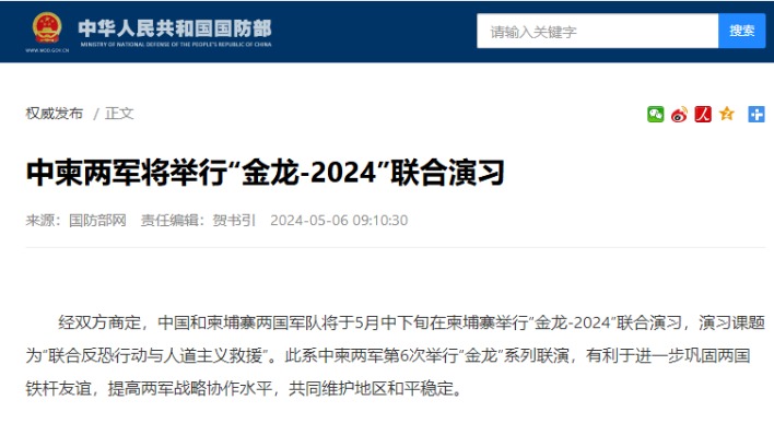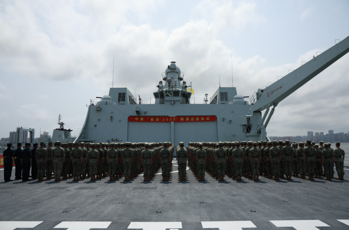 5月8日下午,中柬“金龍-2025”聯演出征儀式在湛江某軍港碼頭舉行。圖源:南部戰區 張曉剛大校說,這是中柬兩軍第7次舉行該系列聯演,對增進雙方務實合作、推動新時代全天候中柬命運共同體建設發揮積極作用。 去年5月中下旬,中柬兩軍在柬舉行“金龍-2024”聯合演習,演習課題為“聯合反恐行動與人道主義救援”。(完) 【編輯:彭玉婷】