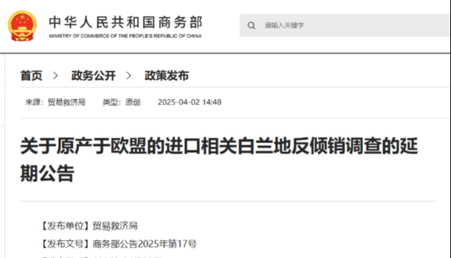 香港中通社5月8日電 就中國商務部去年1月對原產於歐盟的進口相關白蘭地發起反傾銷調查,中方宣布鑒於本案情況複雜,案件調查已延期至2025年7月5日。