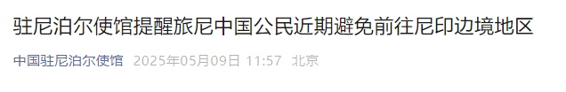 中使館提醒:中國公民近期避免前往尼印邊境地區分享到: