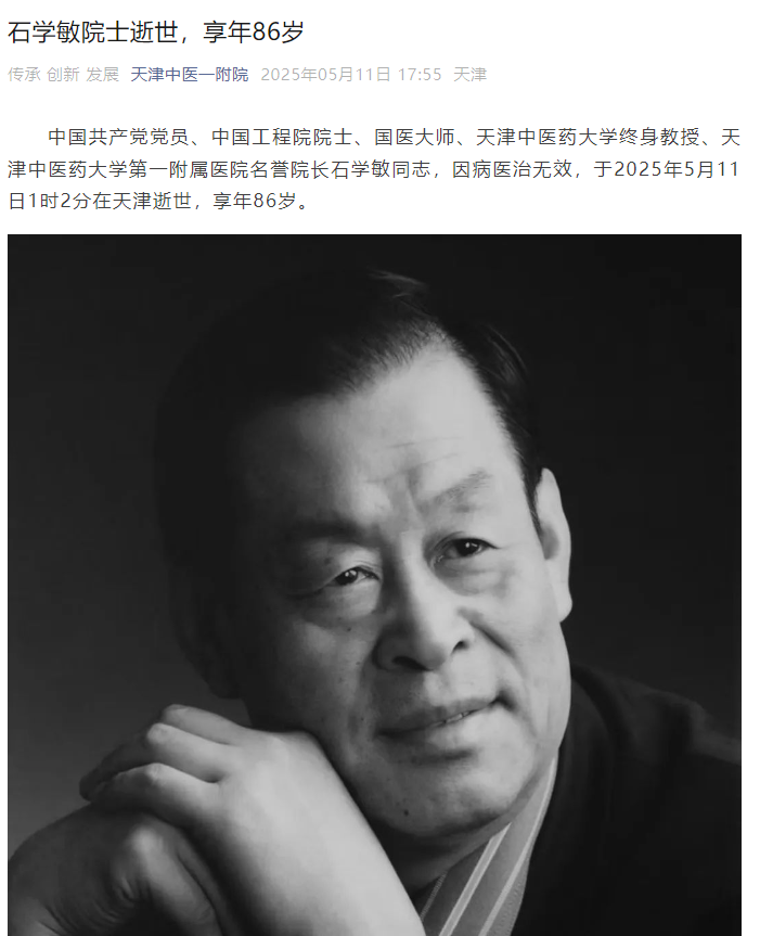 香港中通社5月11日電 中國天津中醫藥大學第一附屬醫院11日發布訃告,中國工程院院士、國醫大師、天津中醫藥大學終身教授、天津中醫藥大學第一附屬醫院名譽院長石學敏,因病醫治無效,於5月11日1時2分在天津逝世,享年86歲。