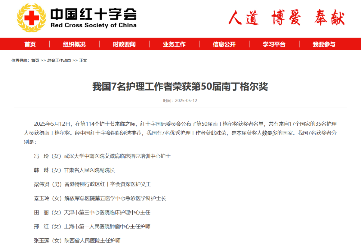 “中國紅十字會”官網截圖 7名獲獎者分別是:馮玲(女),武漢大學中南醫院艾滋病臨床指導培訓中心護士;韓琳(女),甘肅省人民醫院副院長;梁偉賢(男),香港特別行政區紅十字會資深醫護義工;秦玉玲(女),解放軍總醫院第五醫學中心急診醫學科護士長;田麗(女),天津市第三中心醫院臨床護理中心主任;邢紅(女),上海市第一人民醫院腫瘤中心主任護師;張玉蓮(女)陝西省人民醫院主任護師。 今年5月12日是第114個國際護士節,中國國家衛生健康委的信息顯示。近年來,中國註冊護士數量以年均8%左右的幅度逐年增加。目前醫療機構提供延續性護理服務的病區佔比超85%,解決患者出院後的常規護理、專病護理問題。 目前中國各地共計4000餘家醫療機構為群眾提供7類60餘項上門護理服務項目。(完) 【編輯:彭玉婷】