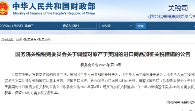 香港中通社資料圖片 公告稱,為落實中美經貿高層會談的重要共識,根據《中華人民共和國關稅法》、《中華人民共和國海關法》、《中華人民共和國對外貿易法》等法律法規和國際法基本原則,經中國國務院批准,自14日12時01分起,調整對原產於美國的進口商品加征關稅措施。有關事項如下: 一、調整《國務院關稅稅則委員會關於對原產於美國的進口商品加征關稅的公告》(稅委會公告2025年第4號)規定的加征關稅稅率,由34%調整為10%,在90天內暫停實施24%的對美加征關稅稅率。 二、停止實施《國務院關稅稅則委員會關於調整對原產於美國的進口商品加征關稅措施的公告》(稅委會公告2025年第5號)和《國務院關稅稅則委員會關於調整對原產於美國的進口商品加征關稅措施的公告》(稅委會公告2025年第6號)規定的加征關稅措施。 中國商務部新聞發言人12日表示,本次中美經貿高層會談取得實質性進展,大幅降低雙邊關稅水平,美方取消了共計91%的加征關稅,中方相應取消了91%的反制關稅;美方暫停實施24%的“對等關稅”,中方也相應暫停實施24%的反制關稅。這一舉措符合兩國生產者和消費者的期待,也符合兩國利益和世界共同利益。(完) 【編輯:李雪萍】
