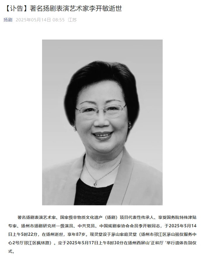 香港中通社5月14日電 李開敏治喪委員會14日發布訃告,著名揚劇表演藝術家、中國國家級非物質文化遺產(揚劇)項目代表性傳承人、享受國務院特殊津貼專家、揚州市揚劇研究所一級演員李開敏,於5月14日上午5時22分,在揚州逝世,享年87歲。