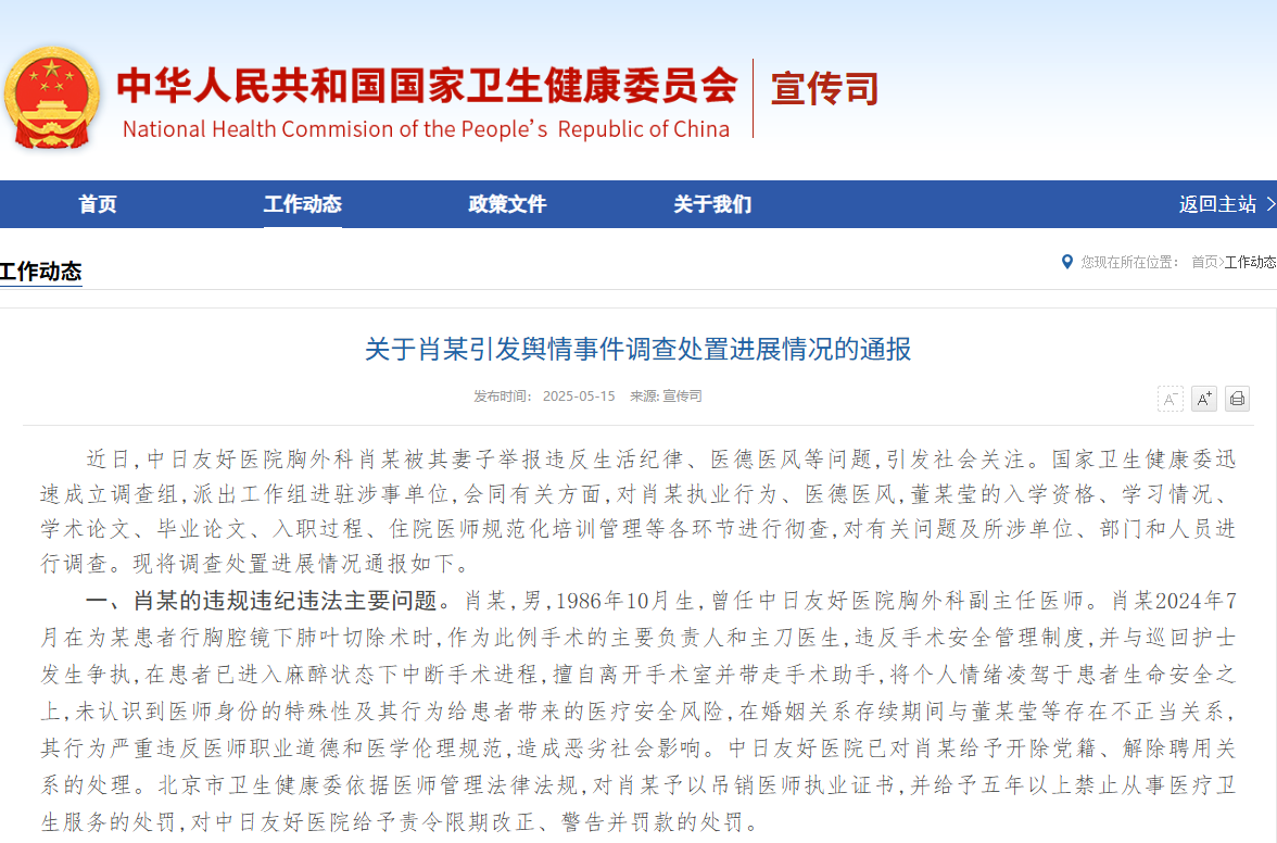 5月15日,國家衛生健康委發布了該事件調查處置進展情況的通報 通報顯示,國家衛生健康委對肖某執業行為、醫德醫風,董某瑩的入學資格、學習情況、學術論文、畢業論文、入職過程、住院醫師規範化培訓管理等各環節進行徹查,對有關問題及涉事單位、部門和人員進行調查。 通報稱,肖某2024年7月在為某患者行胸腔鏡下肺葉切除術時,作為此例手術的主要負責人和主刀醫生,違反手術安全管理制度,並與巡迴護士發生爭執,在患者已進入麻醉狀態下中斷手術進程,擅自離開手術室並帶走手術助手,將個人情緒凌駕於患者生命安全之上,未認識到醫師身份的特殊性及其行為給患者帶來的醫療安全風險,在婚姻關係存續期間與董某瑩等存在不正當關係,其行為嚴重違反醫師職業道德和醫學倫理規範,造成惡劣社會影響。 對於肖某,中日友好醫院已對其給予開除黨籍、解除聘用關係處理。北京市衛生健康委對肖某予以吊銷醫師執業證書,並給予五年以上禁止從事醫療衛生服務的處罰。 對於董某瑩,北京協和醫學院按程序撤銷董某瑩的畢業證書、學位證書。北京市衛生健康委對其醫師資格證書、醫師執業證書予以撤銷。 對於北京協和醫學院“4+4”試點班,通報中指出,本次事件暴露出其在錄取資格確定、臨床實習管理等方面存在問題,目前北京協和醫學院正在深入整改。 目前,國家衛生健康委調查組正聯合有關部門,對本次事件涉及的相關單位、人員開展深入調查,對違規違紀違法等問題將嚴肅追責問責,調查情況將向社會公布。(完) 【編輯:彭玉婷】
