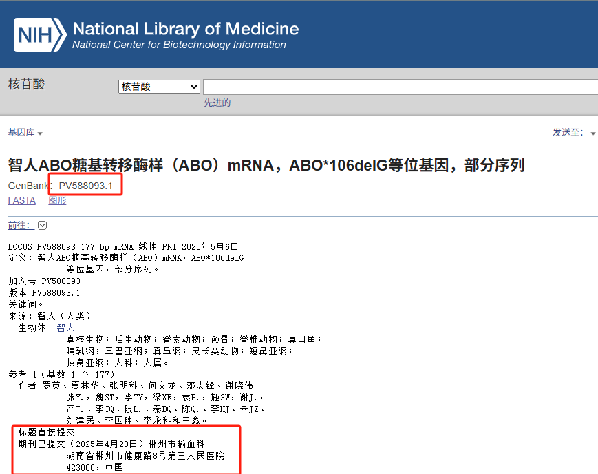 相關序列數據成功收錄至NCBI的人類DNA序列數據庫“GenBank”中,新突變序列號為PV588093。圖源:“GenBank”網頁截圖(網頁翻譯) 完成基因測序後,相關序列數據經過美國國家生物技術信息中心(NCBI)專家的嚴格審核,成功收錄至NCBI的人類DNA序列數據庫“GenBank”中,新突變序列號為PV588093。最終,這一全新B等位基因型血型得以由國際輸血協會公布並正式命名。(完) 【編輯:彭玉婷】