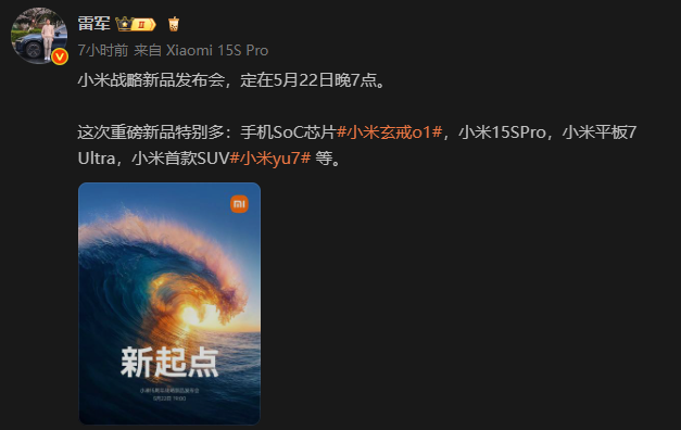 香港中通社5月19日電 中國科企小米CEO雷軍19日在社交平台表示,小米戰略新品發布會定在5月22日晚7點。他表示,這次重磅新品特別多:手機SoC芯片小米玄戒o1、小米15SPro,小米平板7 Ultra,小米首款SUV小米YU7等。