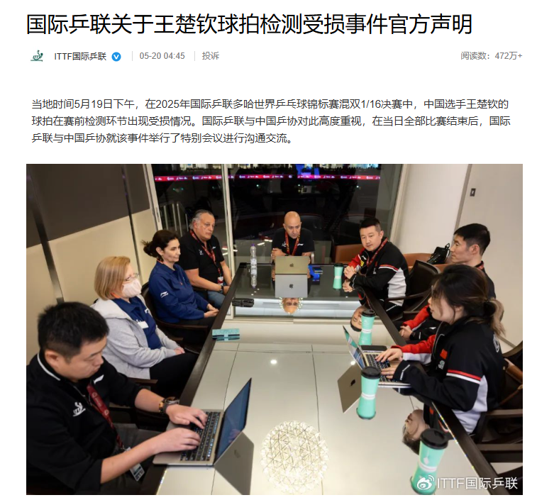 5月19日,王楚欽(左)更換球拍後讓裁判進行檢查。圖片來源:新華社 在當日全部比賽結束後,國際乒聯與中國乒協就該事件舉行了特別會議,進行溝通交流。中國乒協主席王勵勤、中國乒協秘書長何瀟、國際乒聯競賽團隊、裁判團隊以及球拍檢測團隊負責人參加本次會議。 王勵勤表達了對該事件的關切,詳細闡述了事件發生後中國乒協所采取的行動,包括第一時間詢問運動員、教練員情況,并與工作人員進行交流,同時代表乒協就球拍檢測受損事件提出抗議和申訴,要求調取監控并且要求調查事件原因。為避免該類事件再次發生,中國乒協提出三點意見,國際乒聯一一進行回應。 ——中國乒協希望在此事件之後,能够由工作人員全程跟隨球拍檢測并確保沒有任何無關人員可以接觸到檢測後的球拍。 國際乒聯表示,根據賽事規則,允許各支球隊派一名工作人員全程跟隨。 ——中國乒協希望後續賽事更換更大且更安全的球拍檢測容器。 國際乒聯表示,在該事件發生後,已第一時間要求組委會提供A4尺寸的大信封,并要求所有裁判員在工作過程中小心謹慎對待球拍,同時強調球拍檢測團隊的操作程序是正確的。 ——中國乒協要求球拍檢測過程全程錄像。 國際乒聯表示從本次世乒賽實際操作角度,全程錄像暫時無法實現。國際乒聯將在未來比賽過程中逐步推進。 經過雙方充分討論,國際乒聯與中國乒協還達成以下共識:國際乒聯與場館方確認是否有監控後及時反饋。國際乒聯將繼續深入調查球拍受損原因,并形成書面調查報告。