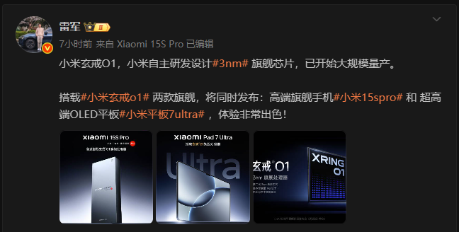 圖源:“雷軍”微博平台賬號 這是小米繼2017年推出首款自研芯片澎湃S1後,時隔8年再次推出手機主控芯片,標誌著小米在半導體領域的重大突破。 5月19日,雷軍在社媒宣布玄戒O1即將亮相。央視新聞隨後發表評論稱,這是中國內地3nm芯片設計的一次突破,緊追國際先進水平。小米將成為繼蘋果、高通、聯發科後,全球第四家發布自主研發設計3nm制程手機處理器芯片的企業。 近年來,不少中國民營科企布局自研芯片,如華為推出自研系統級芯片麒麟,vivo推出了自研圖像處理芯片V3等。(完) 【編輯:彭玉婷】