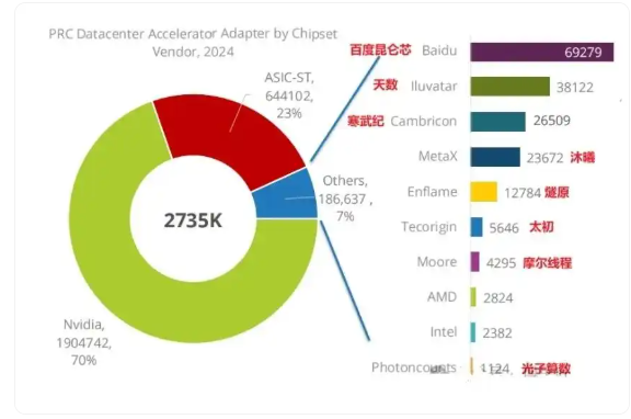 除了華為昇騰,天數、寒武紀、沐曦、燧原、太初、摩爾線程等國產芯片廠商也在不斷發力,雖然它們的市場份額目前合計只有 7% 左右,但卻代表著國產芯片的新生力量。這些廠商在不同的細分領域深耕,有的專注於雲端 AI 芯片,有的專注於邊緣端 AI 芯片,顯示出中國 AI 芯片市場的多元化發展。