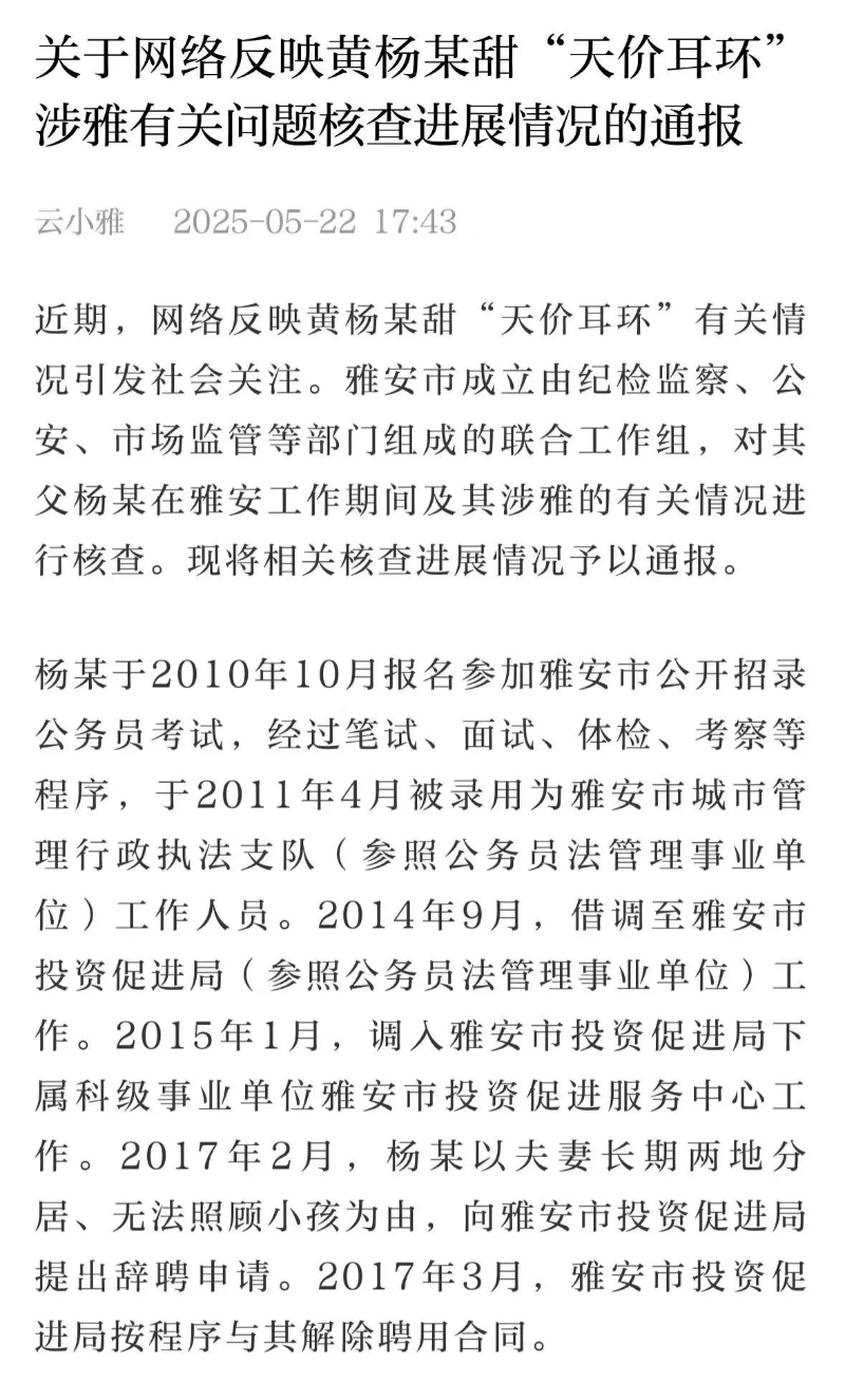 香港中通社5月22日電 近期,網絡反映黃楊某甜“天價耳環”有關情況引發中國社會關注。四川省雅安市成立聯合工作組,對其父楊某在雅安工作期間及其涉雅的有關情況進行核查,並於5月22日將相關核查進展情況予以通報。