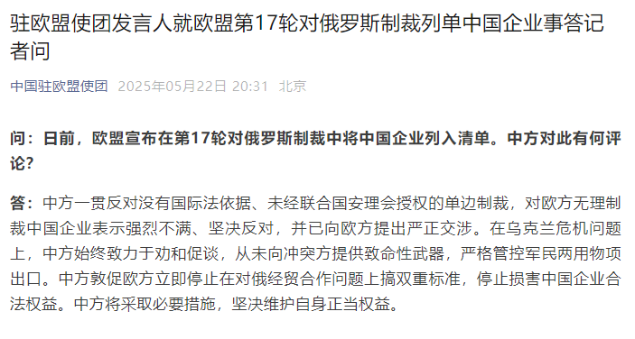 圖源:“中國駐歐盟使團”微信公眾號 中國駐歐盟使團發言人當日說,在烏克蘭危機問題上,中方始終致力於勸和促談,從未向衝突方提供致命性武器,嚴格管控軍民兩用物項出口。中方敦促歐方立即停止在對俄經貿合作問題上搞雙重標準,停止損害中國企業合法權益。中方將採取必要措施,堅決維護自身正當權益。