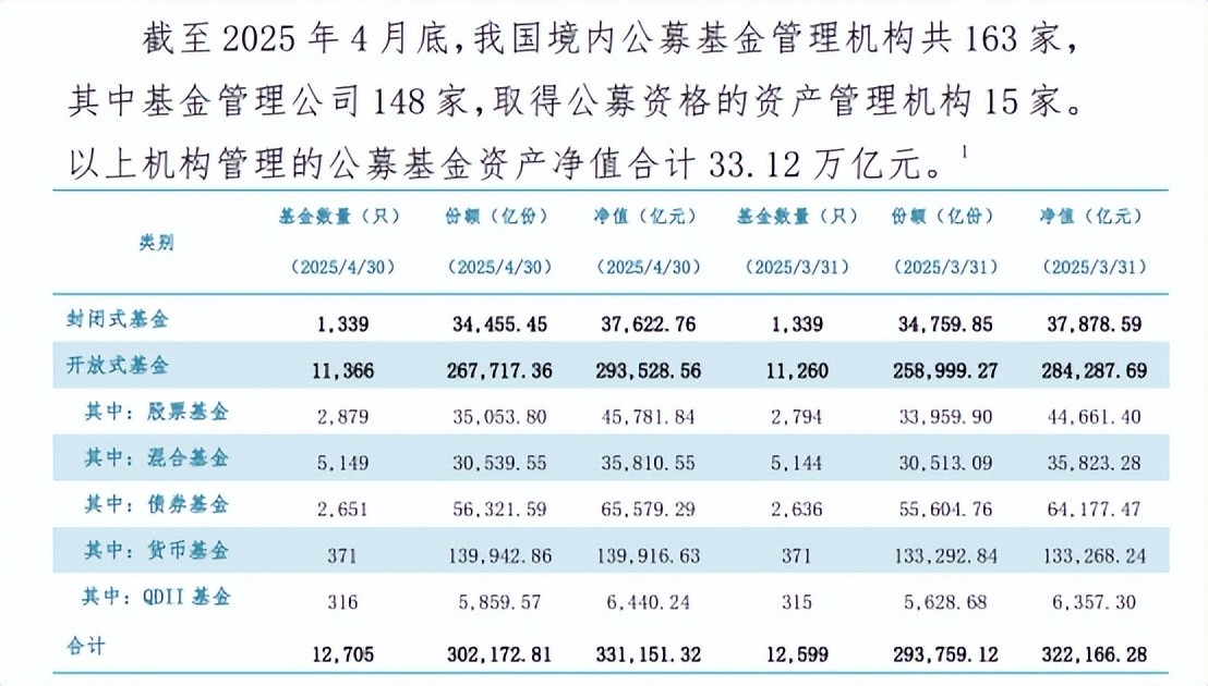 香港新聞網5月28日電 中國證券投資基金業協會(簡稱“中基協”)最新發布的數據顯示,截至2025年4月底,中國公募基金資產淨值合計33.12萬億元,首次突破33萬億元關口。與3月底相比,公募基金規模增長8985.04億元。