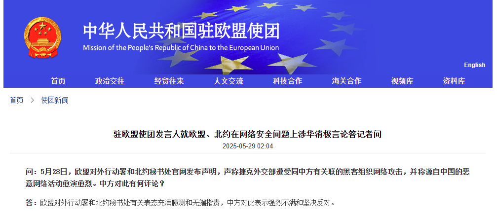 圖源:中國駐歐盟使團官網截圖 中國駐歐盟使團發言人29日說,中方一貫堅決反對並依法打擊各種形式的網絡攻擊,不鼓勵、支持或縱容黑客攻擊行為。聯合國負責任國家行為框架明確指出,網絡攻擊溯源應基於確鑿證據。中方絕不接受有關方面在沒有任何證據的情況下,借網絡安全問題污蔑抹黑中國。 發言人還指出,中國也是網絡攻擊的主要受害國之一。一段時間以來,來自境外惡意程序對中國政府、高校、科研機構、大型企業及關鍵基礎設施大肆發動網絡攻擊,對中國國家安定、經濟社會發展和人民正常生產生活造成嚴重危害。 發言人表示,中方一貫主張各方應在相互尊重、平等互利基礎上,通過雙邊對話或司法協助等渠道加強合作,共同應對網絡安全威脅,堅決反對有關方面操弄網絡安全問題,服務自身狹隘地緣政治目的。中方願與國際社會一道,共同維護和平、安全、開放、合作的網絡空間。(完) 【編輯:彭玉婷】