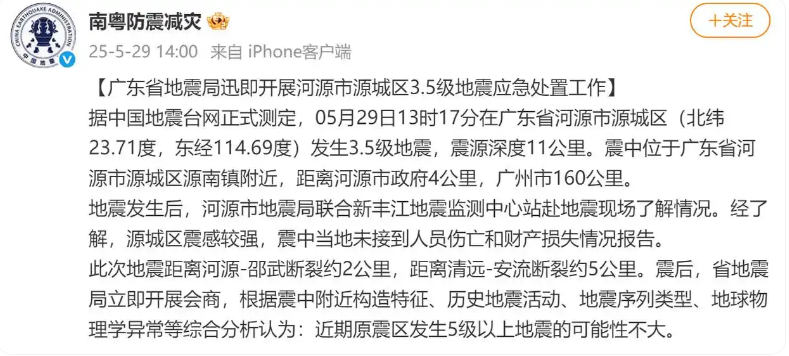 (微博截圖) 據介紹,地震發生後,河源市地震局聯合新豐江地震監測中心站赴地震現場了解情況。經了解,源城區震感較強,震中當地未接到人員傷亡和財產損失情況報告。 廣東省地震局表示,此次地震距離河源—邵武斷裂約2公里,距離清遠—安流斷裂約5公里。震後,廣東省地震局立即開展會商,根據震中附近構造特征、歷史地震活動、地震序列類型、地球物理學異常等綜合分析認為:近期原震區發生5級以上地震的可能性不大。(完) 【編輯:李彥洲】