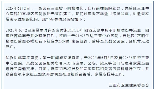 (報道截圖) 李先生稱,當時他姐姐和男朋友在一起,在一處花壇附近被咬傷,醫院初步診斷為蟲咬傷、不明物咬傷,後來他姐姐出現併發症昏厥抽搐,轉院去另一家醫院後身亡。 家屬悲痛之餘,質疑首診的三亞中心醫院存在誤診、延誤治療,以及後續接診的三亞四二五醫院搶救措施不當,認為兩家醫院的處置是導致悲劇的關鍵因素。 6月3日,當地衛健部門表示,三亞市衛健委已介入,於3日凌晨組織會談並調取病歷,承諾將依法依規進行調查處置。(完) 【編輯:李彥洲】