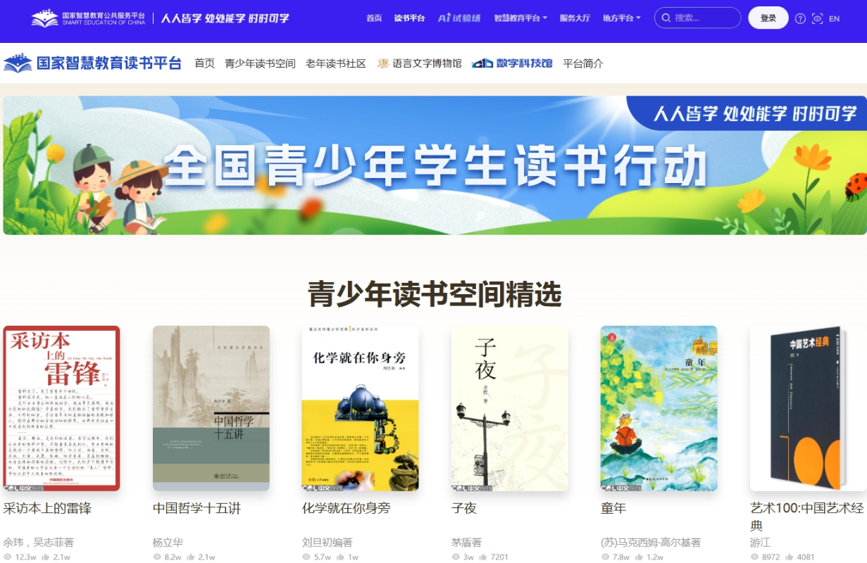 國家智慧教育讀書平台網站截圖 據中國教育部新聞辦5日消息,近日,中國教育部辦公廳、中共中央宣傳部辦公廳聯合印發《關於深入實施全國青少年學生讀書行動的通知》,提出除上述科技賦能閱讀創新工程外,還包括以下四大工程。 實施書香校園建設工程。將閱讀有機融入學校教育教學,倡導分學段閱讀目標,開展“每天閱讀一小時”“周末閱享半日”行動,營造濃厚書香氛圍。 實施閱讀資源優化工程。豐富資源供給,強化閱讀推廣,開展“一人一本書,送你金鑰匙”活動。關愛特殊群體,實施“光明未來計劃”和“鄉村學校圖書館振興計劃”。 實施閱讀素養培育工程。研製青少年閱讀指數,加強閱讀指導隊伍建設,探索家庭親子閱讀指導路徑策略。 實施閱讀成果展示轉化工程。鼓勵青少年學生閱讀後進行深度思考,開展“行走閱讀”,做到讀思結合,知行合一。(完) 【編輯:淩玉輝】