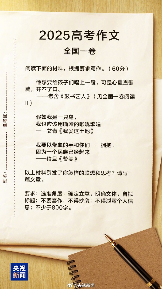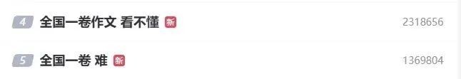 微博熱搜榜截圖 每年中國高考作文考題備受關注。語文考試當日上午結束後,各地考題相繼公佈。其中,全國一卷作文的難度與立意引發熱議,“全國一卷 難”“全國一卷作文 看不懂”等詞條登上微博熱搜。 全國一卷作文試題以組合材料形式呈現,選取老舍《鼓書藝人》、艾青《我愛這土地》、穆旦《讚美》三則文學片段,要求考生挖掘材料內在邏輯進行寫作。