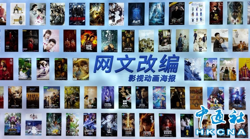2025年6月20日,第31屆北京國際圖書博覽會上,圖為網絡文學專題展區的網文改編影視動漫海報牆。香港中通社圖片