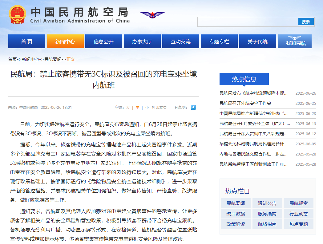 圖源:中國民航局官網 通知指,今年以來發生多宗旅客攜帶的充電寶等鋰電池產品機上起火冒煙事件,近期多個頭部品牌充電寶廠家因電芯存在安全風險對多批次產品實施召回,中國國家市場監管總局撤銷或暫停了多個充電寶及電池芯廠家3C認證,上述情況表明旅客隨身攜帶的充電寶存在安全質量隱患,給民航安全運行帶來的風險持續增大。民航局決定進一步採取嚴格的管控措施。 通知要求,各航司及其代理人應加強對充電寶起火冒煙事件的警示宣傳,讓更多旅客了解相關產品的安全風險和管控政策,積極引導旅客不攜帶不合格充電寶乘機。各機場要充分利用廣播、動態顯示屏等形式,在安檢通道、值機櫃枱等醒目位置張貼宣傳資料或增加提示環節,多場景密集宣傳攜帶充電寶乘機安全風險及管控政策。要合理設置旅客對充電寶的自棄、暫存區域,明確暫存手續和流程,為旅客自棄、暫存提供便利,提升旅客對政策的理解度和配合度。 同時,通知指出,各機場要抓緊做好航站樓內旅客充電設施的加裝、維護,提高充電設備設施的可用性、可得性,更好滿足旅客進、出港時的充電需求。 通知又說,各單位要按要求進一步完善鋰電池起火、冒煙等緊急情況下的應急處置預案,增強員工情景意識、應急反應能力和協同配合能力,確保在發生緊急情況時能夠及時、妥善處置。