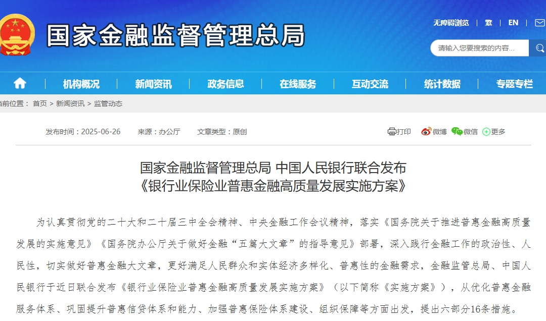 中國國家金融監督管理總局網站截圖 據國家金融監督管理總局26日消息,《實施方案》提出六部分16條措施,聚焦優化普惠金融服務體系、提升普惠信貸能力、加強普惠保險體系建設及組織保障。 消息指,具體包括:健全多層次、廣覆蓋、差異化的普惠金融機構體系,完善縣鄉村金融服務、普惠信貸管理體系,提升小微企業、“三農”、脫貧地區及特定群體信貸支持力度,強化民營企業信貸服務;推動保險公司專業化建設,豐富普惠保險產品供給,提升服務質量,並加強監管政策引領。 《實施方案》強調,在中央集中統一領導下,持續提升普惠金融覆蓋面和可得性,降低綜合成本,滿足民眾和實體經濟多樣化需求。金融管理部門和銀行保險機構需加強組織協調、隊伍建設、數字賦能及宣傳引導,確保政策落地。(完) 【編輯:淩玉輝】