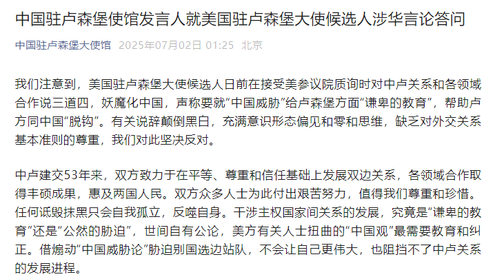 香港中通社7月2日電 美國駐盧森堡大使候選人日前在接受美參議院質詢時對中盧關係和各領域合作說三道四,妖魔化中國,聲稱要就“中國威脅”給盧森堡方面“謙卑的教育”,幫助盧方同中國“脫鈎”。中方7月2日就此表示,有關說辭顛倒黑白,充滿意識形態偏見和零和思維,缺乏對外交關係基本準則的尊重,我們對此堅決反對。