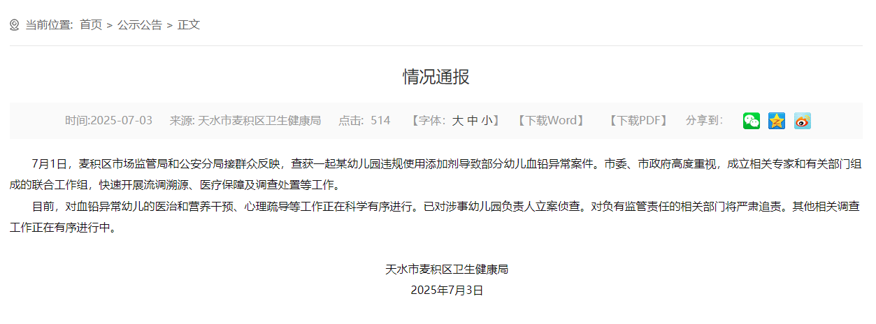 情況通報截圖。圖源:天水市麥積區人民政府官網 通報稱,已對涉事幼兒園負責人立案偵查。對負有監管責任的相關部門將嚴肅追責。其他相關調查工作正在有序進行。 鉛是一種重金屬,它對人體無任何生理功能。低水平鉛暴露主要損害兒童的神經系統發育,包括影響兒童的認知和行為發育。而急性高水平鉛暴露可致中毒性腦病及多臟器功能損害。6歲以下的兒童由於處於快速的生長發育階段,機體各個器官都容易受到鉛的傷害。兒童比成人更容易鉛中毒。(完) 【編輯:石歡歡】