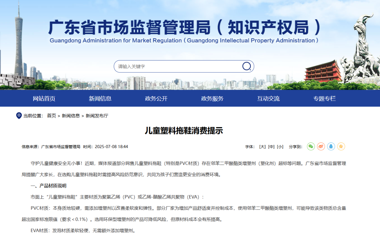 香港中通社7月9日電 近期,中國內地部分網售兒童塑料拖鞋被曝鄰苯二甲酸酯類增塑劑超標,引發健康安全擔憂。對此,中國廣東省市場監督管理局發布消費提醒,呼籲消費者選購兒童塑料拖鞋時提高風險防範意識。