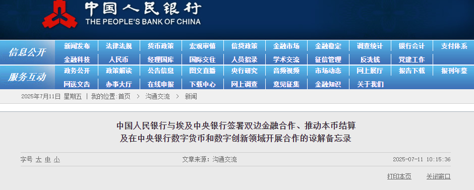 香港新聞網7月11日電 據中國人民銀行官網消息,中國人民銀行與埃及中央銀行7月10日簽署諒解備忘錄,雙方將加強雙邊金融合作,推動本幣結算,並在央行數字貨幣和數字創新領域開展合作。