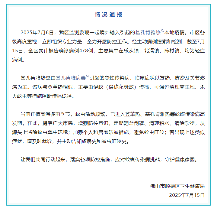 香港中通社7月15日電 7月15日,中國廣東佛山市順德區衛生健康局官方微信公眾號“健康順德”通報稱,7月8日,順德區監測發現一起境外輸入引起的基孔肯雅熱本地疫情。截至7月15日,順德區累計報告確診病例478例,均為輕症病例。