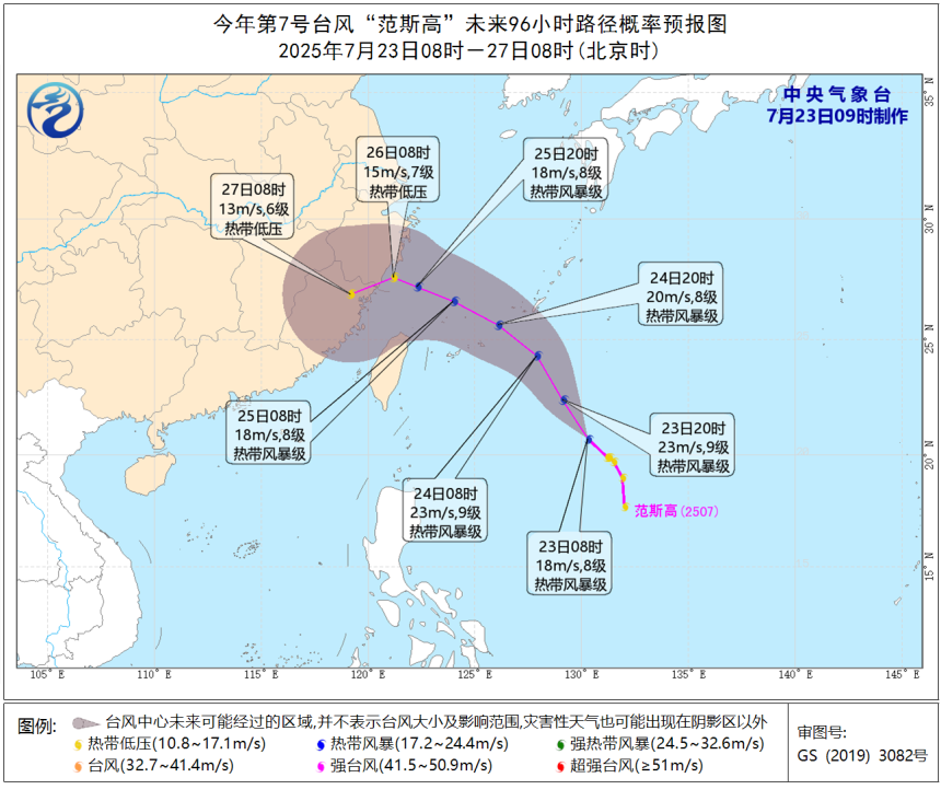 中央氣象台圖片 預計,“范斯高”將以每小時15至20公里的速度向北偏西方向移動,強度逐漸增強。24日夜間移入東海南部海面,最強可達熱帶風暴級或強熱帶風暴級(23至25米/秒),並向中國浙江南部到福建北部一帶沿海靠近。 據介紹,“范斯高”的名字來源於美國,意義為查莫羅(Chamorro)男子名。查莫羅人是對馬里亞納群島上土著人的稱呼,大洋洲西北部的民族之一。(完) 【編輯:馬華】