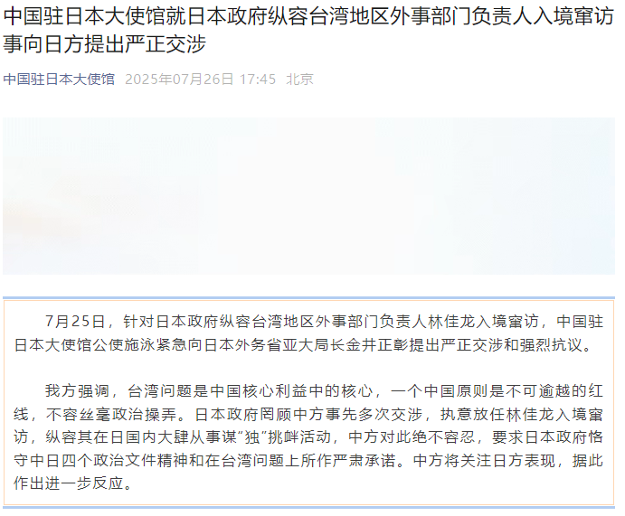 圖源:“中國駐日本大使館”微信公眾號截圖 中方強調,台灣問題是中國核心利益中的核心,一個中國原則是不可逾越的紅線,不容絲毫政治操弄。日本政府罔顧中方事先多次交涉,執意放任林佳龍入境竄訪,縱容其在日國內大肆從事謀“獨”挑釁活動,中方對此絕不容忍,要求日本政府恪守中日四個政治文件精神和在台灣問題上所作嚴肅承諾。中方將關注日方表現,據此作出進一步反應。 另據中國外交部網站消息,7月25日,外交部亞洲司司長劉勁松緊急約談日本駐華使館首席公使橫地晃,就林佳龍竄訪日本一事進行嚴正交涉,提出強烈抗議。 劉勁松表示,台灣問題是中國核心利益中的核心,事關中日關係政治基礎和兩國間基本信義。日方縱容林佳龍以所謂“私人身份”竄訪,為其從事反華分裂政治活動提供舞台,發出嚴重錯誤信號。今年是中國人民抗日戰爭暨世界反法西斯戰爭勝利80周年,也是台灣光復80周年。中方敦促日方恪守中日四個政治文件精神和在台灣問題上所作鄭重承諾,立即採取措施消除此事惡劣影響。(完) 【編輯:彭玉婷】