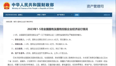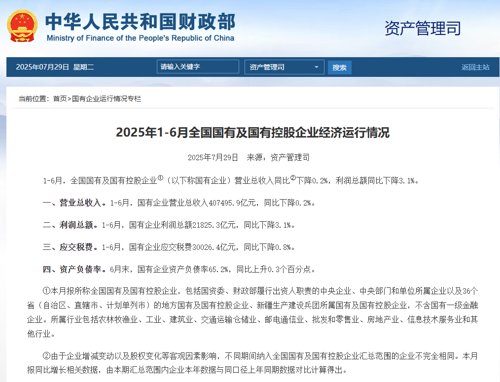 圖源:中國財政部官網截圖 據統計,1-6月,國有企業營業總收入降幅較1-5月擴大0.1個百分點;利潤總額21825.3億元,同比下降3.1%,降幅較1-5月擴大0.3個百分點;應交稅費30026.4億元,同比下降0.8%。6月末,國有企業資產負債率65.2%,同比上升0.3個百分點。此前1-5月數據表明,國有企業利潤總額同比下降7.6%。 7月23日至24日,國務院國資委舉辦地方國資委負責人研討班,國務院國資委主任張玉卓說,要因地制宜發展新質生產力,開啟增長“第二曲線”。會議提出,高質量完成國企改革深化提升行動,圍繞“三個集中”優化國有資產配置,調整存量結構,推動重組整合,抵制“內捲式”競爭,形成新的資本布局。 7月25日至26日,張玉卓赴上海調研央企戰略性新興產業,強調提升科技創新能力,將成果應用於產業鏈,改造傳統產業,培育新興產業,強化與各類企業的協同攻關,打造有競爭力的產品與服務。(完) 【編輯:彭玉婷】