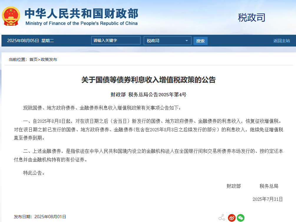 香港中通社8月4日電 根據中國財政部、國家稅務總局發布的《關於國債等債券利息收入增值稅政策的公告》(下稱《公告》),自2025年8月8日起,對在該日期之後(含當日)新發行的國債、地方政府債券、金融債券的利息收入,恢復徵收增值稅。此次政策調整採用“新老劃斷”原則,對8月8日前已發行的相關債券利息收入,繼續免徵增值稅直至債券到期。