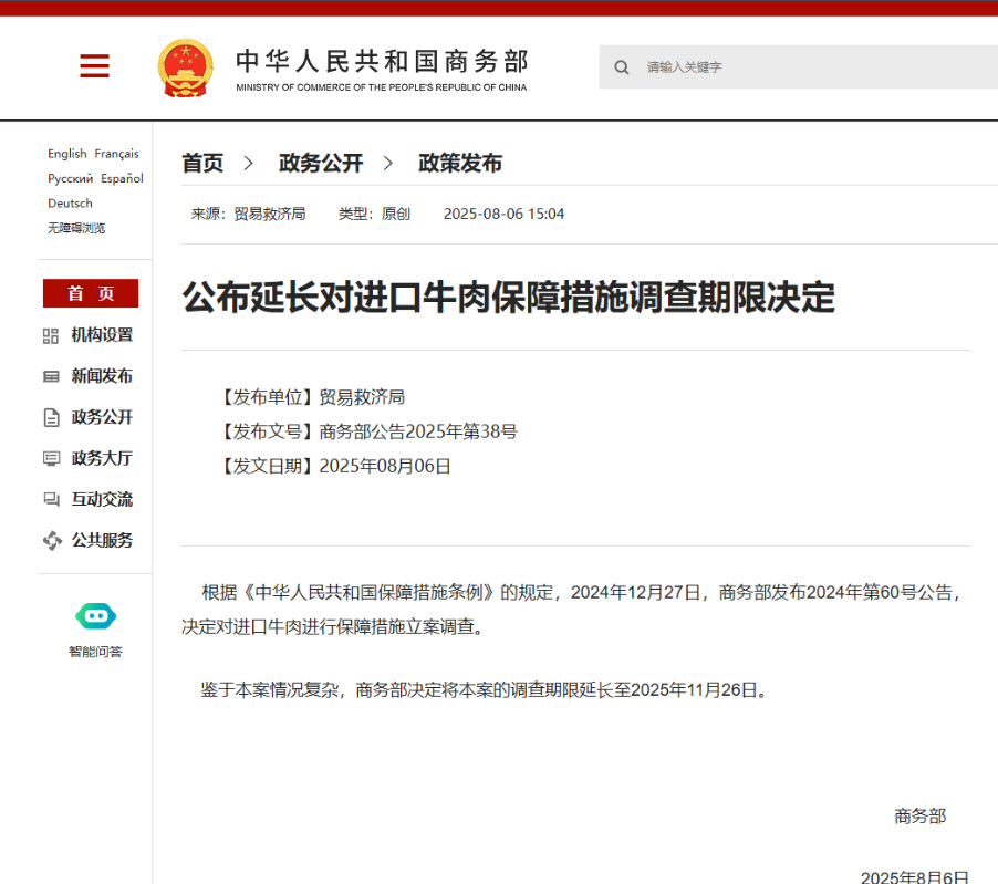 中國商務部官網截圖 6日,中國商務部新聞發言人就對牛肉保障措施調查發佈延期公告答記者問。 中國商務部發言人表示,牛肉保障措施立案後,商務部依照法定程序開展調查,通過問卷、聽證會、實地調查等方式收集證據材料,廣泛聽取各利害關係方意見,確保調查程序客觀公正。該案受到各方廣泛關注,出口國家和地區的政府、行業協會、生產商以及國內產業協會、養殖戶和進口商等提交了大量數據和文字材料,調查機關正在全面審查各方意見和材料,依法審慎評估本案是否達到法定實施保障措施的條件。由於調查工作量大,案情複雜,調查機關決定根據中國法律及世貿組織規則,將本案調查期限延長3個月至2025年11月26日。調查機關將繼續依法推進調查,根據調查結果作出客觀公正裁定。中方將與各方保持溝通,共同維護好健康穩定的國際貿易環境。(完) 【編輯:彭玉婷】