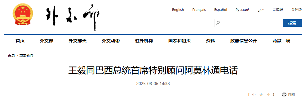 中國外交部官網截圖 據中國外交部消息,王毅說,中方堅定支持巴方捍衛國家主權和民族尊嚴,反對外部對巴西內政的無理干涉;堅定支持巴方維護自身發展權益,抵制濫施關稅的霸凌行徑;堅定支持巴方通過金磚機制鞏固全球南方團結協作,推動發展中國家聯合自強。把關稅當作武器打壓各國,違反聯合國憲章,破壞世貿規則,不得人心,不可持續。中巴作為東西半球最大的發展中國家,始終相互支持,密切協作,堅定維護各自正當利益和全球南方國家共同利益。中方願同巴方一道,共同落實好兩國元首達成的重要共識,深化中巴合作,豐富中巴命運共同體戰略內涵,以雙方合作的穩定性、互補性,有力對衝外部的各種不確定性。
