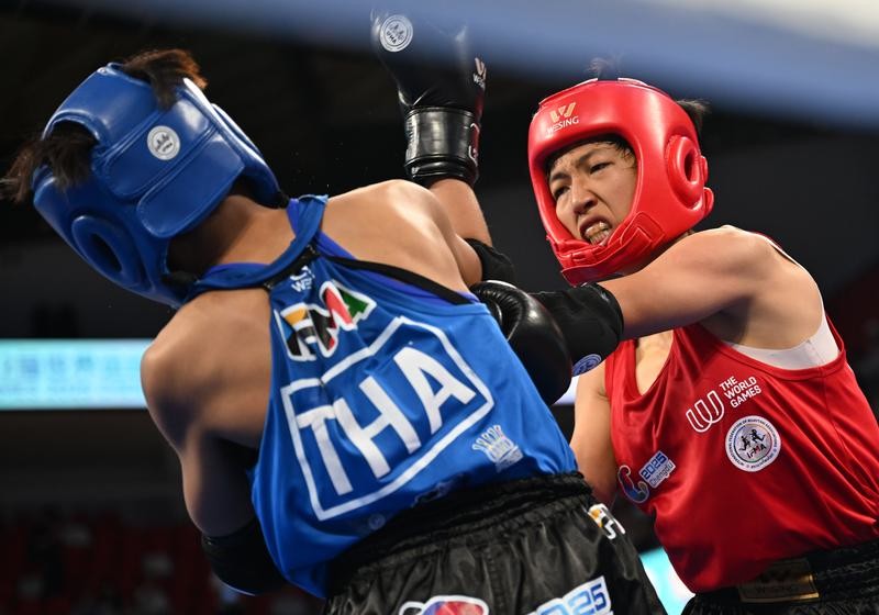 8月10日,劉曉慧(右)在比賽中。 當日,在2025年成都世運會女子48公斤級金牌賽中,中國選手劉曉慧戰勝泰國選手奧諾克(音),奪得冠軍。圖片來源:新華社