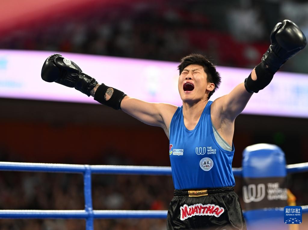 8月10日,韓鑫在奪冠後慶祝。當日,在2025年成都世運會泰拳女子60公斤級金牌賽中,中國選手韓鑫戰勝土耳其選手屈布拉,奪得冠軍。圖片來源:新華社